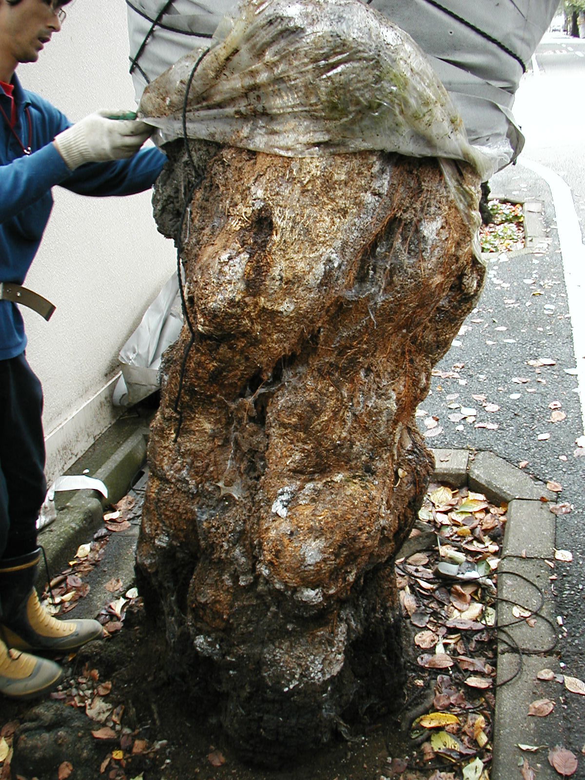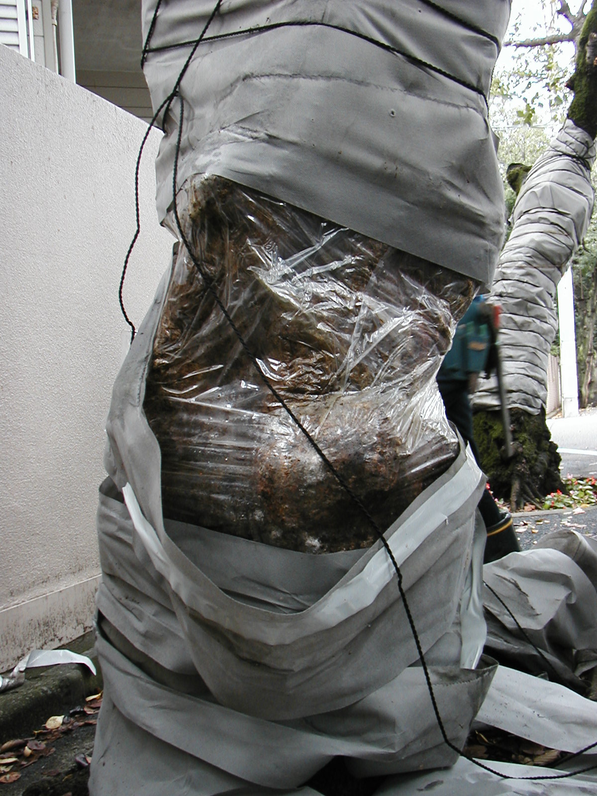 ・樹木医の診断では、2本の木は「胴巻きの効果が出ており、胴巻きをはずしても構わない」という結果となりました。残りの4本は、胴巻き部分を小さくして、保護し、観察することとしました。