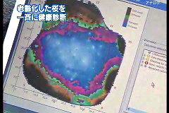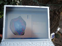 ●この健康診断は、桜木の中が空洞になっていることが判るだけでなく、腐朽状況が判別され、色別に画像として出力されます。診断方法は、幹周りに取り付けた受信機に、ある箇所からの音源の時間を測定して、内部の状況を判別するものです。診断装置はドイツ製で、日本にはまだ5台だけしか輸入されていないものだそうです。