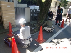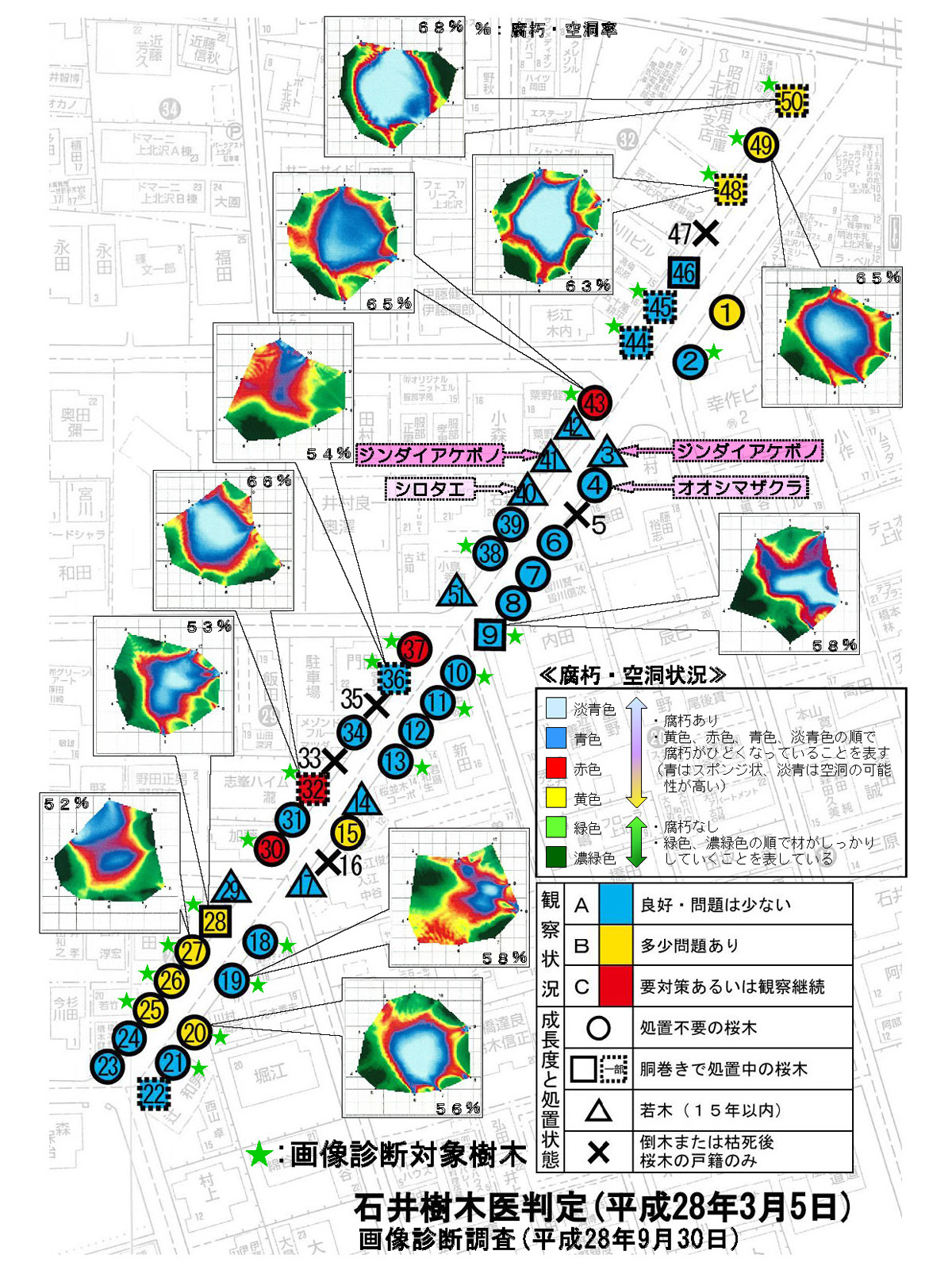 ・桜並木の画像診断は平成21年と22年の2回行っている。画像診断調査は玉川大学の山岡准教授とゼミの学生が行ったが、石井樹木医も指導にあたられた。21年は区の費用、22年は玉川大学のゼミ(学生)独自で行った(桜)