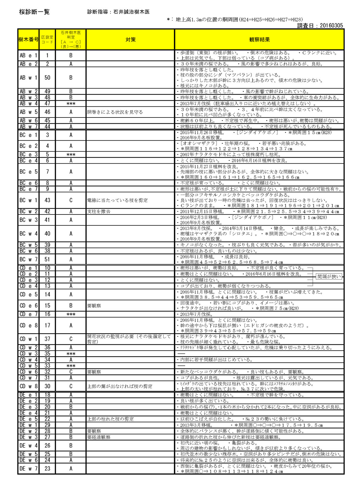 ・結果では、「ランクの変更」は無かったものの、「悪い枝の剪定」「要観察」等の対策が必要となった木が13本あった→今後、葉が茂った時、その後葉が無くなった時等に十分注意が必要である