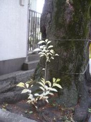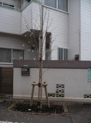 土壌汚染(ナラタケモドキの菌)によって枯れてしまった位置に、「ソメイヨシノ」よりも汚染に対する強さがあるといわれるヤマザクラ系の「シロタエ」を植樹しました。