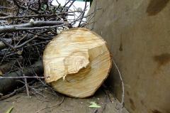No47の伐採後の高さ1mくらいのところの断面を見ますと、素人目には弱っていないように見えましたが、業者の方に聞くと「中はほとんどコルク状で、幹の周りだけが生きている状況」であるとのことでした。