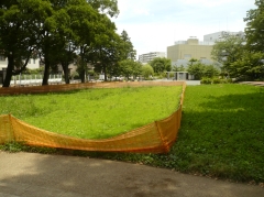 緑化した部分の多くのクローバーが無くなり、土が見えています。