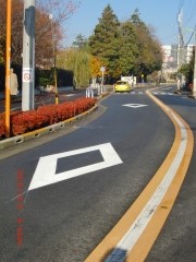 南側から進行する車にはは横断歩道が見えにくく、このマークの設置を要望してまいりましたが、やっと設置されました(両方向ともに)。