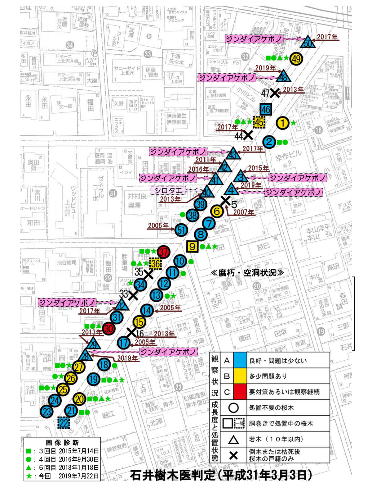 今年(令和元年)7月22日に実施した都合6回目の精密診断(区委託:川端造園(川瀬樹木医担当))の結果を基本に、区が進めている方針や上北沢の桜を最もよく理解しておられる石井誠治樹木医のお考えから、今年度のメンテナンスを以下のように決定いたしました。
