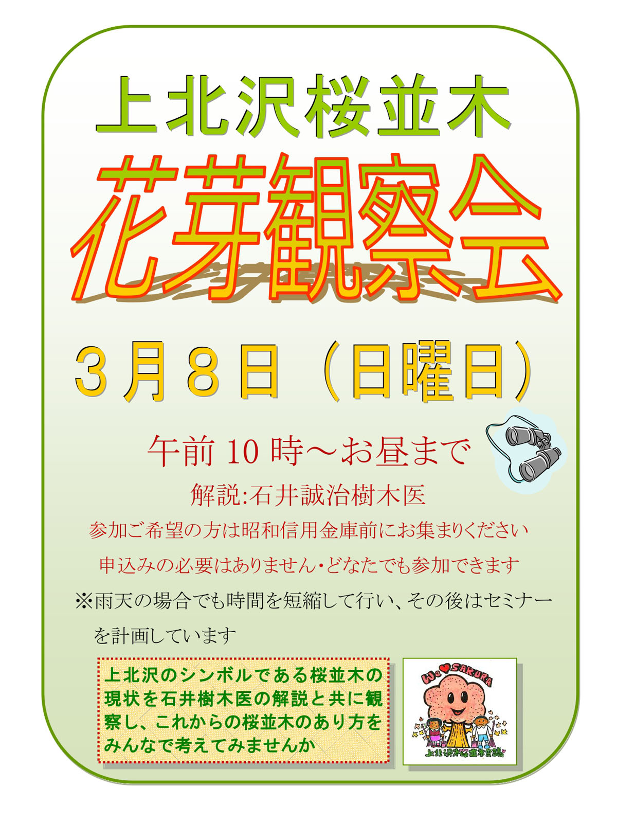なお、花芽観察会としては中止しますが、「桜木の評価」を行う会は実施します。上北沢の桜並木は花芽観察会の時に各桜木を評価し、「ABCランク」を決めています。今回も、石井誠治樹木医の観察評価を受けて、現況の評価表を作成したいと考えています。集合時間等は同じです。